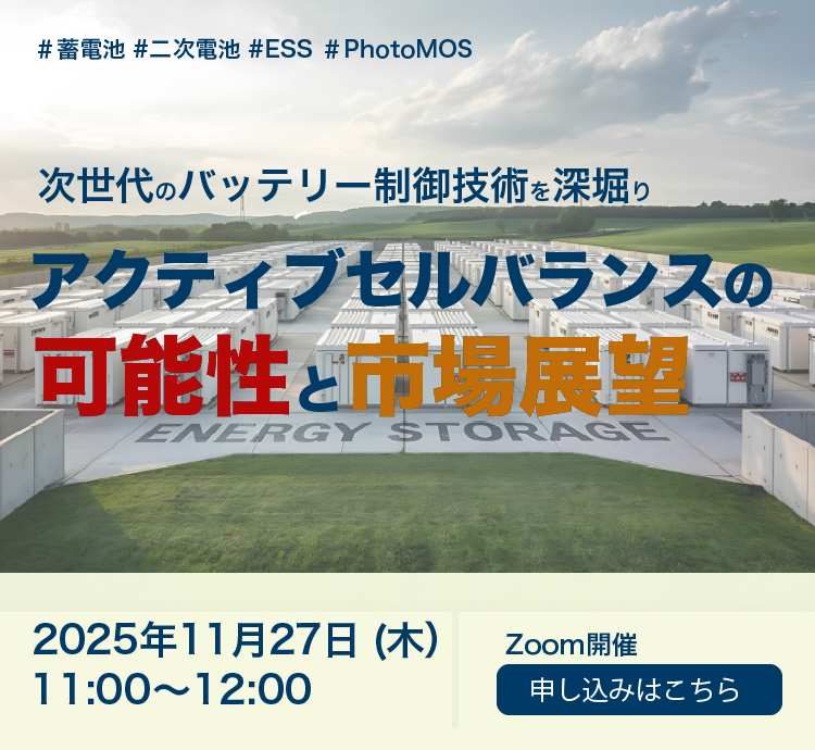 {date} イベント [ウェビナー開催]11/27 11時~ 次世代バッテリー制御技術を深堀り_アクティブセルバランスの可能性 EVや蓄電池システムの高度化が進む中、従来のパッシブ方式では対応しきれない課題が顕在化しています。本ウェビナーでは、アクティブセルバランスの仕組み・メリット・導入事例をわかりやすく解説し、実際に活用できる製品・ソリューションをご紹介します。