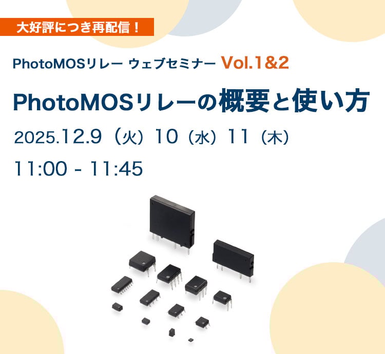 {date} イベントお知らせ [ウェビナー開催]12/9・10・11 11時〜『PhotoMOSリレーの概要と使い方』 昨年開催し、大好評いただいたPhotoMOSリレーウェブセミナーのVol.1とVol.2を合わせて再配信いたします。